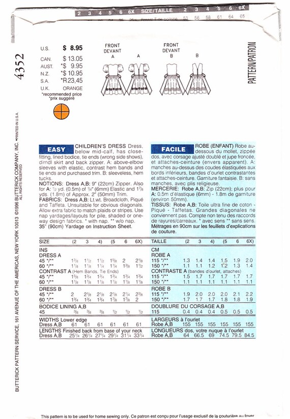 1996 Butterick 4352 Uncut Sewing Pattern Girl S Dress Size Etsy
